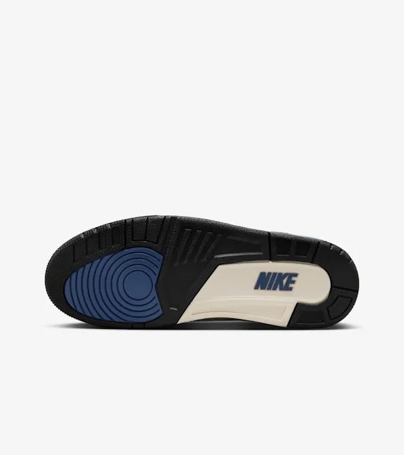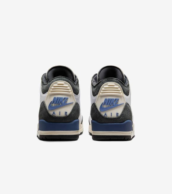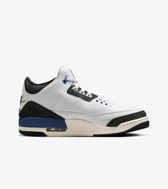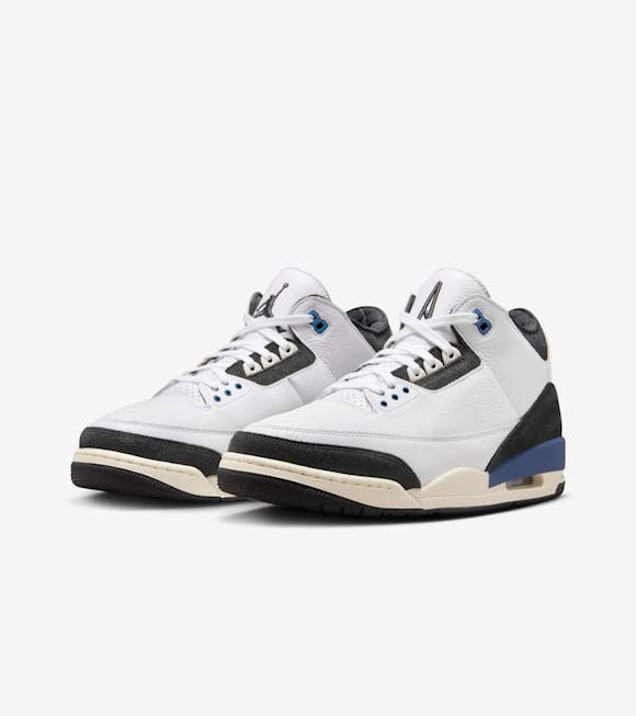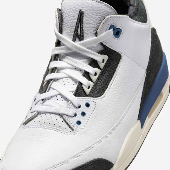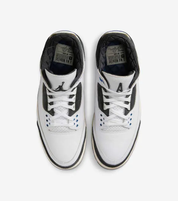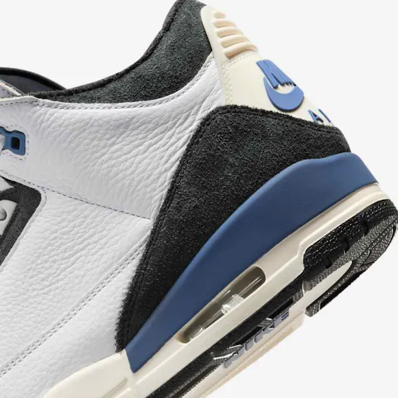 El cuero blanco premium predomina en la parte superior, con revestimientos de gamuza gruesa en color antracita que le aportan profundidad y carácter. Los detalles en azul difuso realzan el diseño, mientras que la marca compartida en la lengüeta presenta el logotipo Jumpman cosido frente al logotipo "A" de A Ma Maniére.